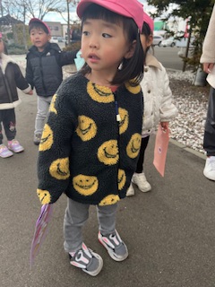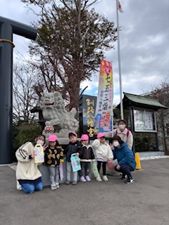 11/14(金)に製作で作った千歳飴袋をもって近くの神社へ!『ニ礼・二拍手・一礼』神主さんに教えてもらいながらお参りしました!お賽銭を入れ、みんなで本坪鈴を鳴らして手を合わせ「元気で大きくなりますように・・・」とお願いしましたよ♪お迎えの際に、千歳飴をプレゼントするととっても喜ぶほしぐみさんでした⭐︎これからも子どもたちの成長を見守っていきたいと思います(^^)