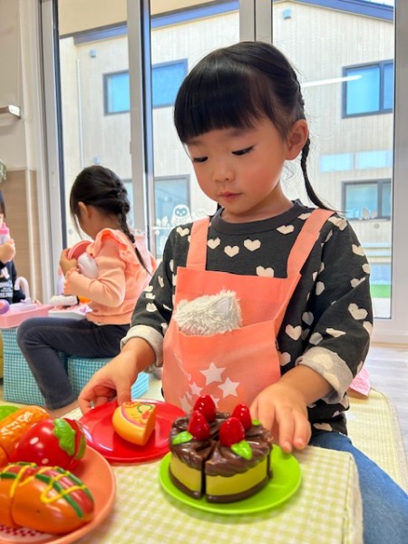 令和7年12月12日つき組ほし組合同でおままごとや人形遊びをしました!おままごとでは、机の上に食材を並べ、お友だちとお料理をしたり誕生日パーティーを開いたり!(^o^)人形遊びでは、お布団を掛け寝かしたり、ご飯をあげたり、抱っこしてお散歩をしたり…と、各々楽しんで遊んでいましたよ♪