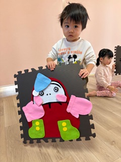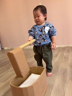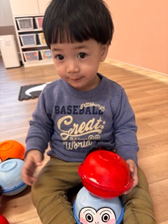 お正月遊びをしました!ダルマ積みでは、中に鈴や粘土などが入っていてバランスを取るのに難しかったのですが、お友だちと一緒に協力しながら高く積むことができました✨福笑いでは、「どこかな〜?」と探しながらはっていき、面白い顔になったり、可愛らしい顔になったり…!楽しんでいる様子でした(^^)もちつきでは、「1.2.3...」とみんなで数を数えたながら餅をついていきましたよ♪