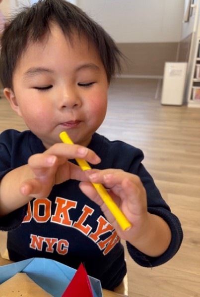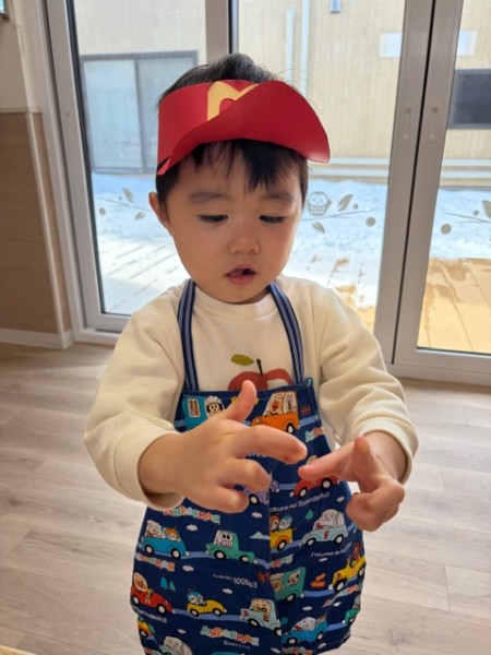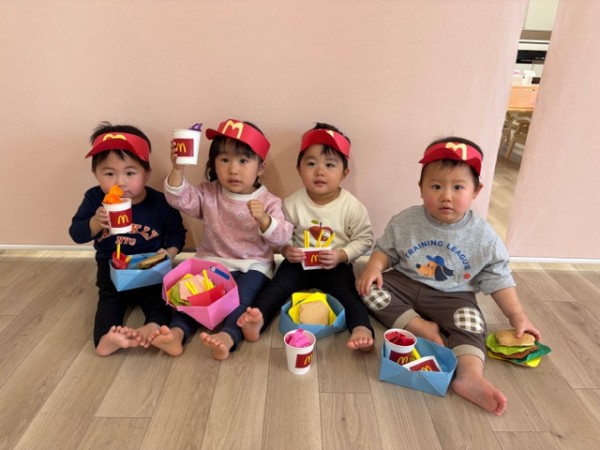 つき組さん「マック」のお店屋さんごっこをしました!「いらっしゃいませー!」「どれにしますかー?」と言ったり、ハンバーガーやポテト、ジュースを店員さん同士で協力し作り楽しんでいる様子でしたよ(^^)お客さん側はお金を持ち、「これください!」とウキウキしながら出来上がりを待っていました♪最後は椅子に座りみんなで美味しく頂きました😄