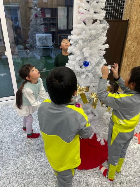 キッズベースにもクリスマスツリーがきました☆ ツリーの飾り付けをお願いすると、「やりたーーい!!」と大盛り上がり!バランスを見ながら可愛く飾り付けをしてくれましたよ♫