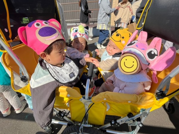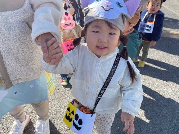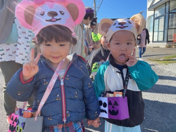10/31(木)にハロウィンイベントを行いました╰(*´︶`*)╯ディズニーキャラクターの帽子を被ってプチ仮装した子どもたち!郵便局さん→交番→商工会議所さん→釧之助さん→ほっともっとさんの順で『ハッピーハロウィン!』『トリックオアトリート!』とお菓子を配りながら歩いてきましたよ♡各所からもお菓子をいただいたり、可愛い旗をいただいたりと、子どもたちもとても喜んでいました(๑>◡<๑)園に戻ると、きー先生から『頑張って歩いたね!』とご褒美が♡ずーっとニコニコの子どもたちでした!