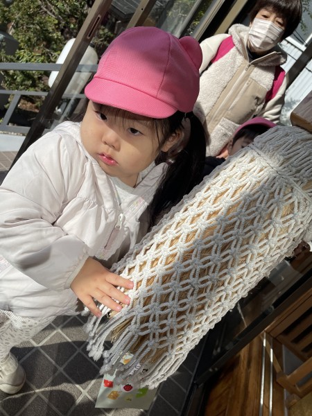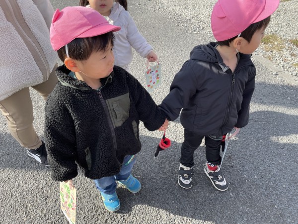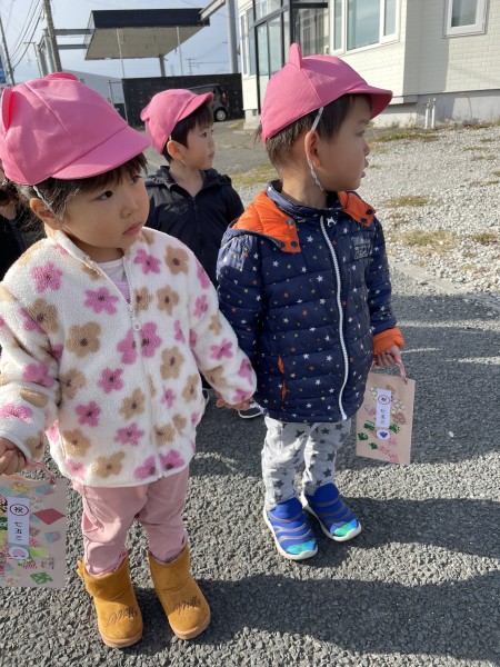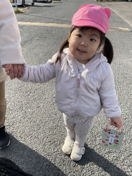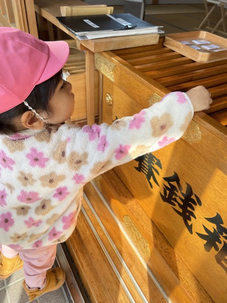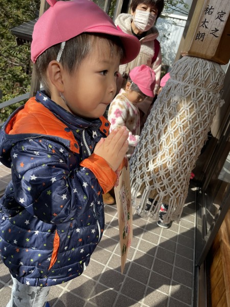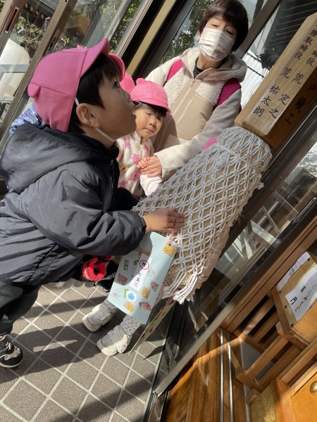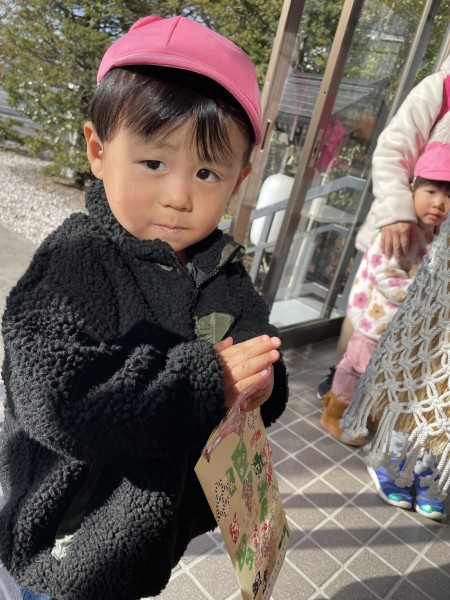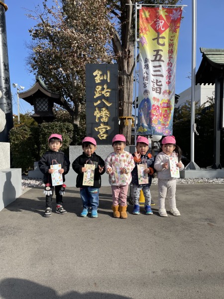 令和6年11月15日七五三の日にほしぐみさんは制作で作った千歳飴袋を持って近くにある神社へお参りに!!一人一人お賽銭をいれ、本坪鈴を鳴らして手を合わせ大きくなれますようにとお願いしました☆お迎えの際に千歳飴をプレゼント♡みんなとても喜んでくれました♡しっかりとお友だちと手を繋ぎ行きも帰りも歩く姿に成長を感じたましたよ!これからも元気いっぱいおおきくな~れ♬