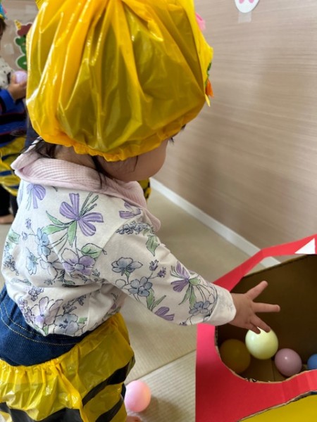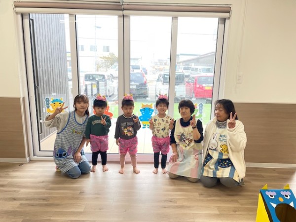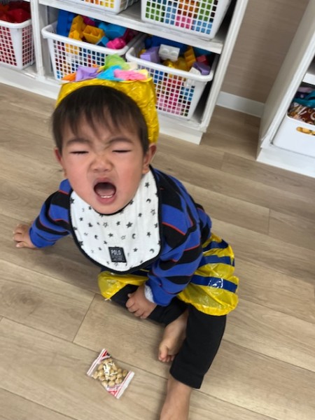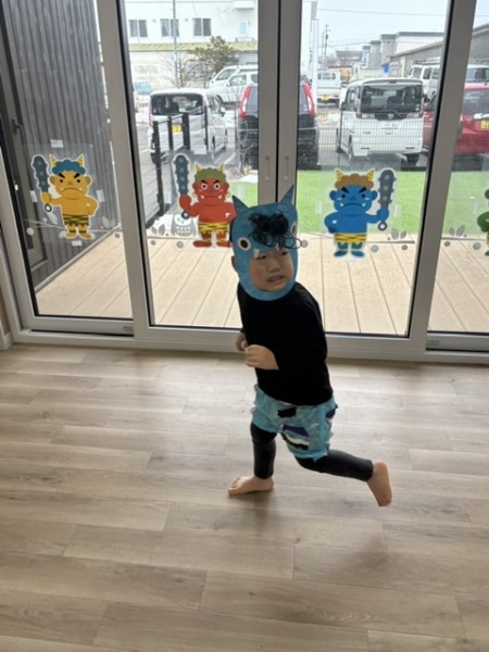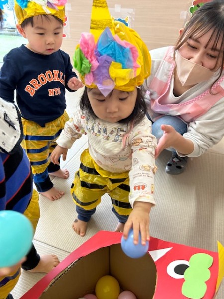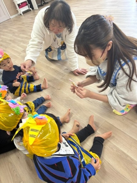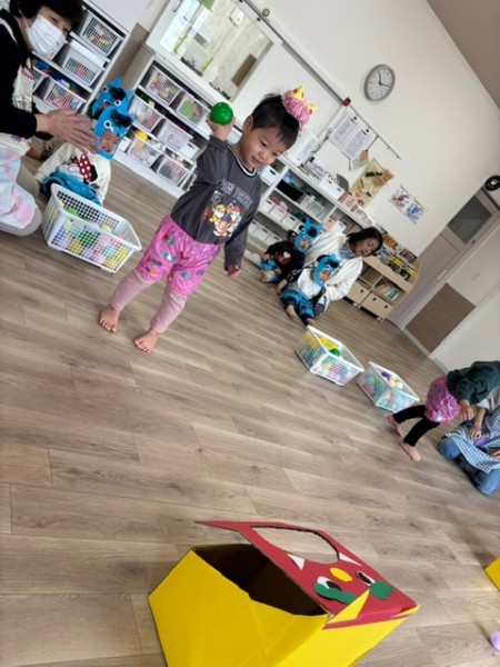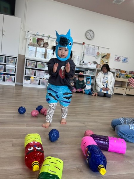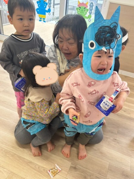 令和7年2月3日 節分がありました☆全クラスそれぞれで製作した鬼のパンツとお面をつけて参加しましたよ♬そらぐみさんはお部屋でつき・ほしぐみさんはホールでゲームをしました!おにのお口にカラーボールを投げたりペットボトルのおにさんを倒したり?!とても盛り上がりました♡そしてホールに集まりみんなで豆まきの歌を歌い、豆ってどんなのかな〜と見ていたらかつら保育園にも2匹の鬼が!!!!驚きで泣いているお友だちもいましたが「おにはーそと!!」と元気に豆を投げることが出来ましたよ!参りました〜と鬼さんが倒れ今年も仲直り!また来年〜とバイバイしました☆午後のおやつにはビーンズドックを食べました^^