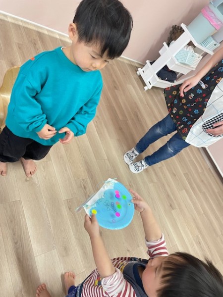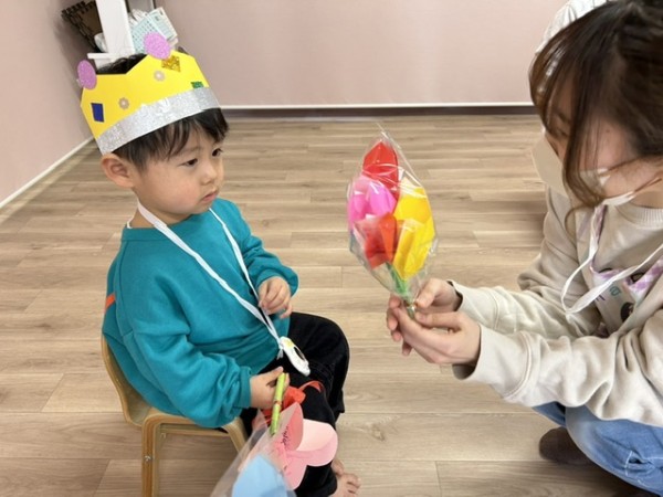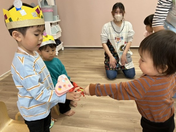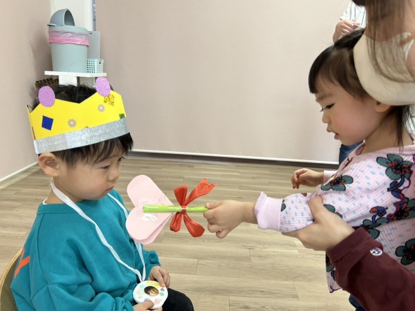 3月13日(木)にお別れ会がありました。そら・つきぐみさんで作った道を歩いて入場!拍手で迎えられ席に着いたほしぐみさん。その後は各クラスと担任からのプレゼントを受け取り、とても喜んでいました♡保育士からの出し物「マジック」では、子どもたちと一緒に魔法をかけたり、色水のマジックではほしぐみさんにもお手伝いしてもらいました✨そして、ゲーム遊びは紅組と白組に分かれて箱乗りリレー!!声を出しながら笑って楽しむ子どもたちでしたよ(^o^)♪