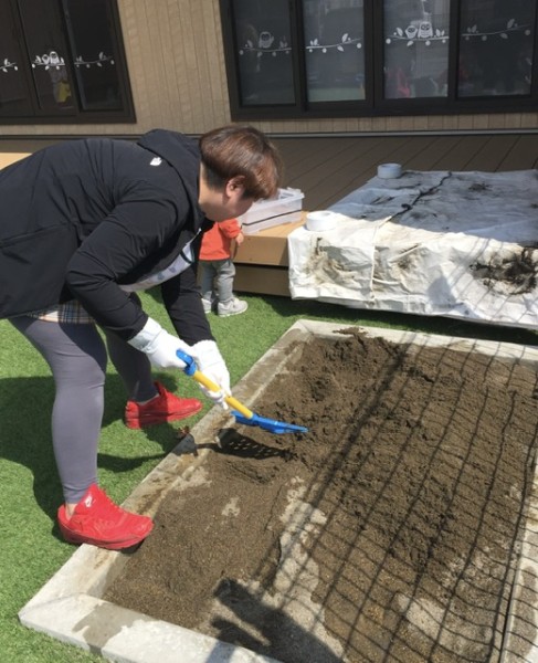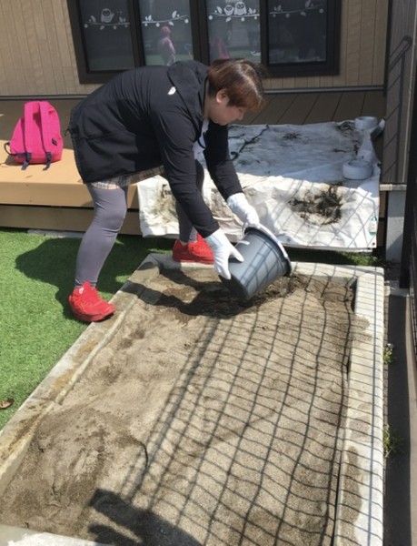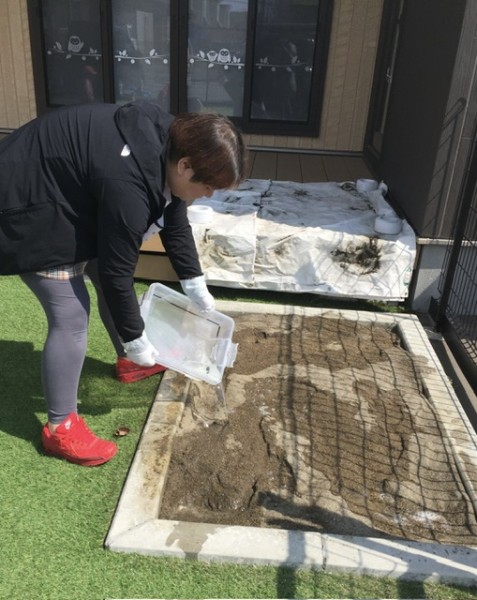 だんだんと暖かくなり、お砂場で遊ぶことが増えてくるので今日は消毒作業をしました!