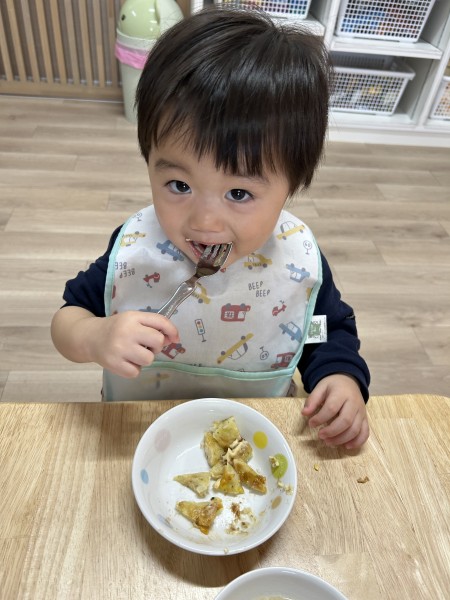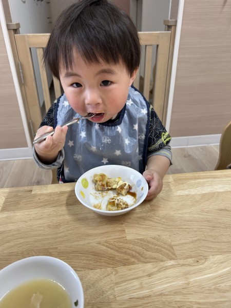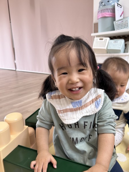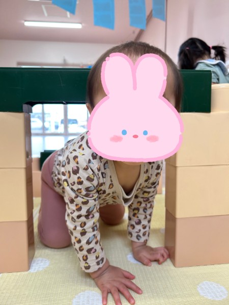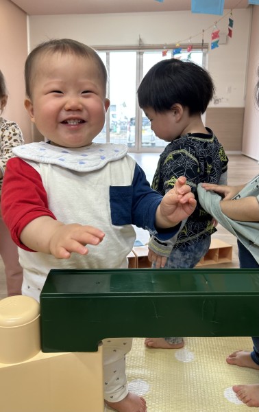 今日は大型ブロックで遊びました!トンネルから「ばぁ!」と言いながら顔を出したり、ブロックで作られたお部屋でお友達同士笑い合いながら楽しく遊んでいる姿が見られました☺︎遊び終えた後は美味しい給食!こいのぼりの形をした「お好み焼き」でした!「美味し〜!」と言いながらたくさんおかわりをしていたつきぐみさんでしたよ♡