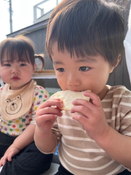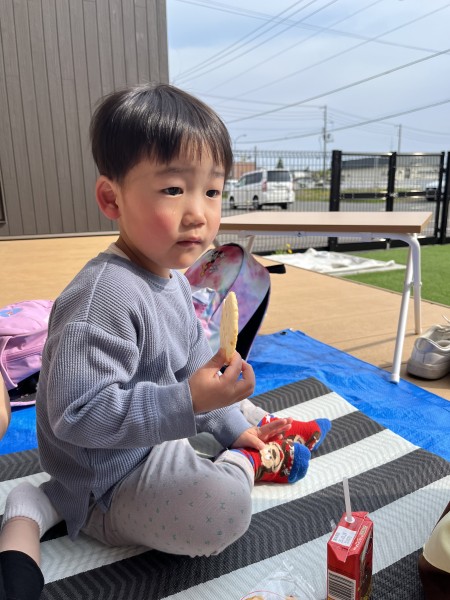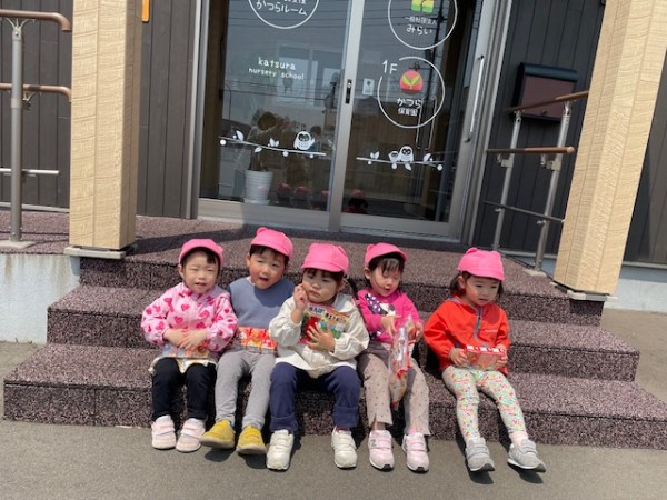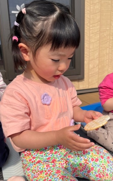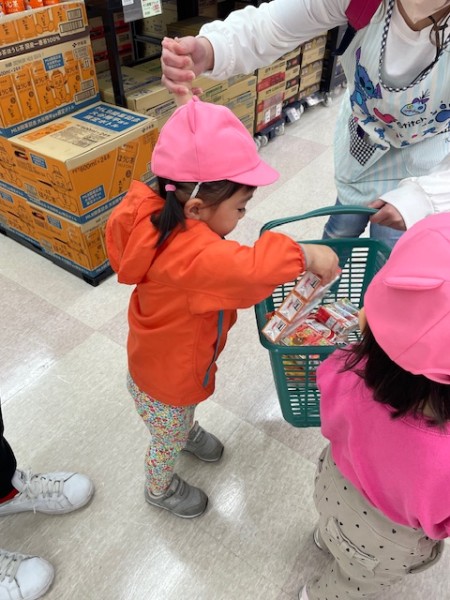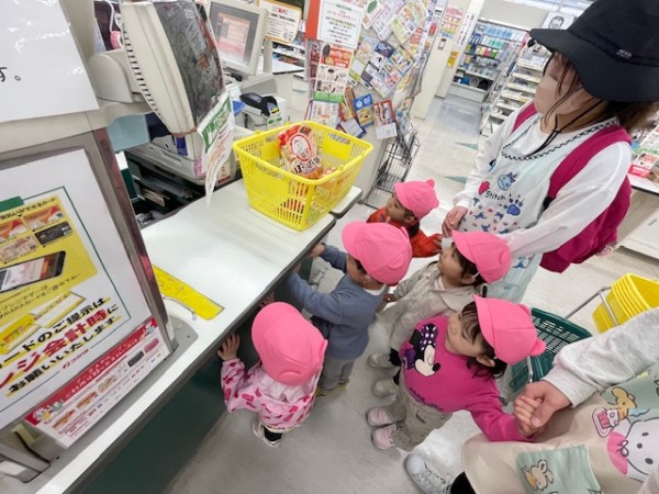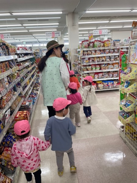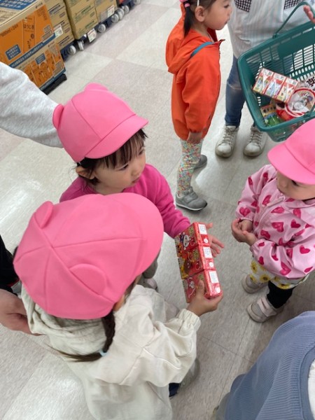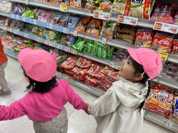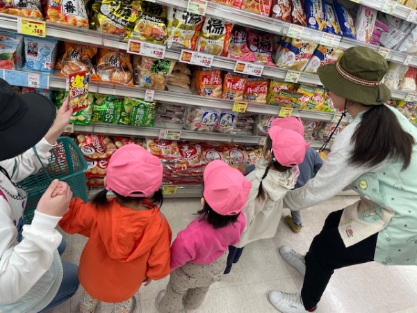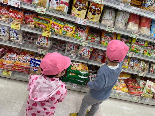 令和7年5月13日(火)午後のおやつのお買い物に行ってきました〜!おやつを買いに行くことを伝えるとやったーーー!!イェーイ!と大喜びのほしぐみさん♬おせんべいとジュースそれぞれ2種類から皆で選び、準備をして出発!!お散歩コースの途中にフクハラがあり、今度おやつ買いに行こうね〜とお話していたのでフクハラが近付いてくると「もう少しで着くね♡」とドキドキ…店内では写真を見ながらおせんべいとジュースを探しました☆レジではお店の方に「ありがとうございます!」と挨拶をするお友だちも!!先生たちもびっくり!!とっても素敵でした♡保育園に着き、栄養士の先生に買ってきたおやつをお願いしますとみんなで預け「はやくみんなで食べたいね〜」と給食前から午後のおやつをたのしみにしている姿がとても可愛かったです(^^)そしてお待ちかねの午後のおやつタイム!!お天気が良かったのでテラスでおやつを食べました♬【自分たちでおやつを買いに行き、みんなで食べる】たのしい経験でした!また買いに行こうね♬《ほしぐみ》