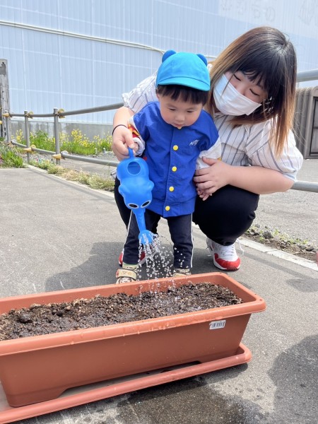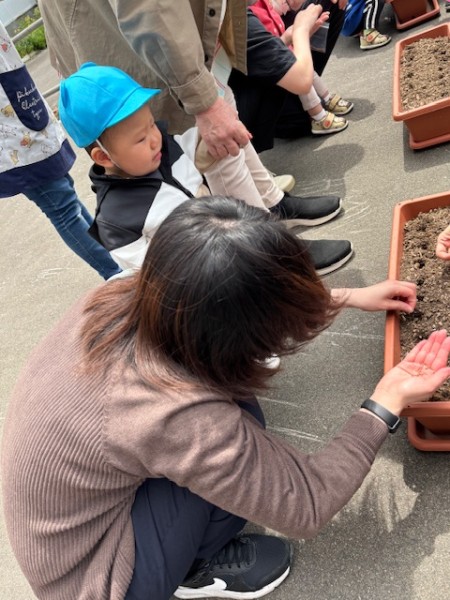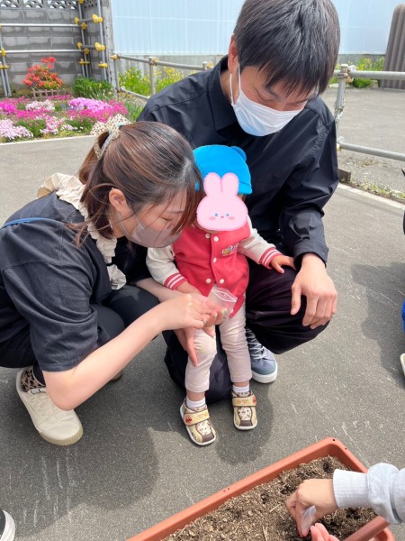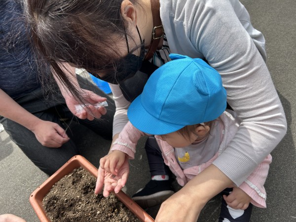 6/6(金)につきぐみさんの参観日を行いました(^^)朝の会では、いつもと違う雰囲気に緊張している姿が見られたつきぐみさんでした☺︎終わった後は、みんなでラディッシュの種植えと園庭遊び!小さな種を指でつまみ、そぉ〜と入れている姿が可愛らしかったです♡園庭遊びでは滑り台を滑ったり、シャボン玉を追いかけたりと、たくさん身体を動かして楽しんでいる様子でした^o^最後は美味しい給食!お父さんお母さんと一緒に食べている子どもたちの姿は笑顔で嬉しそうなお顔でした(o^^o)お忙しい中ご参加いただきありがとうございました!