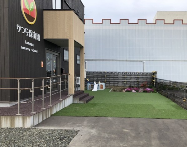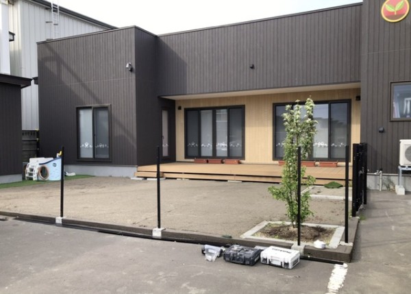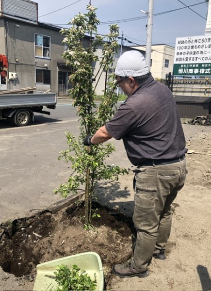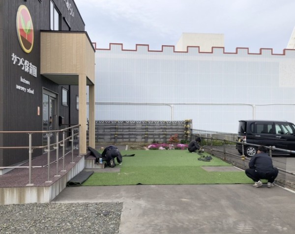 6月7日、工事のため園庭の芝生と柵を玄関前に移設しました^_^工事終了までは、ここが園庭の代わりになります!開園時に植えた姫りんごの木。こちらも花壇に移設。新しい園庭ができるまで花壇で元気に育ちますように!