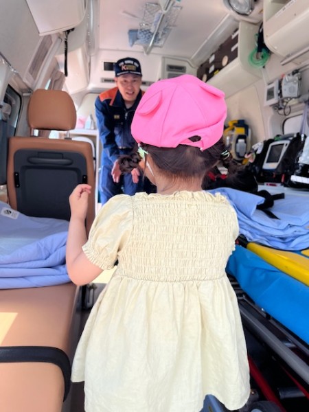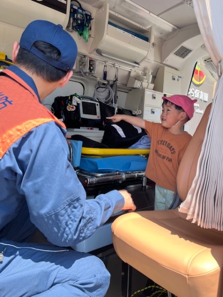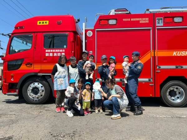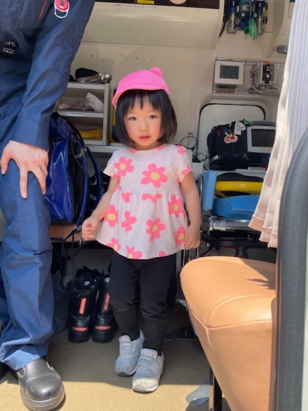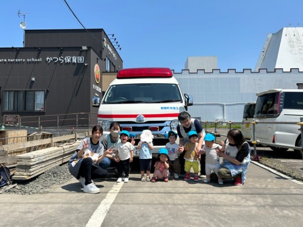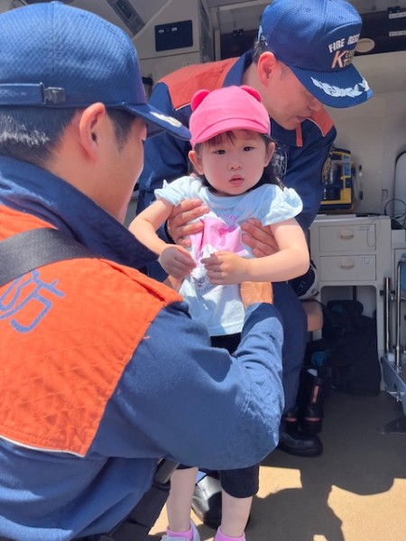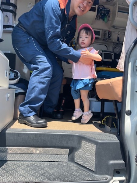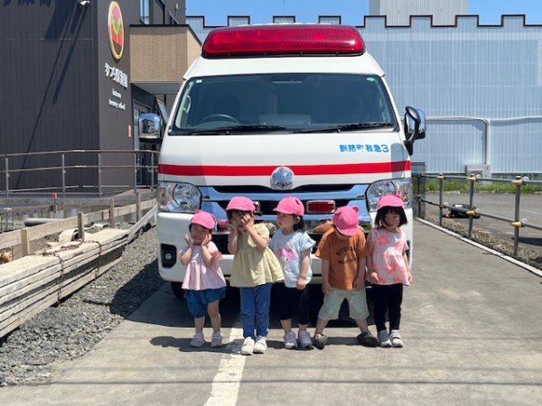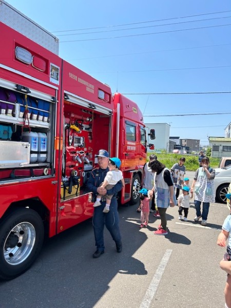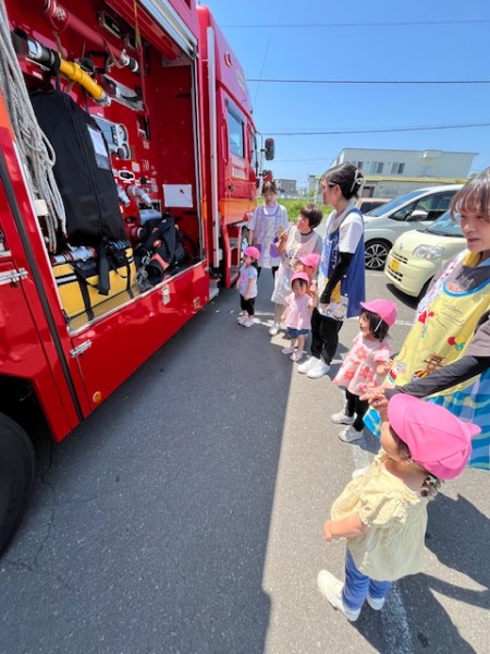 令和7年6月19日(木)避難訓練がありました!消防士の方に来て頂き、避難の指導を受けました。つきぐみさんもほしぐみさんもしっかり保育士と一緒に避難する事が出来ていましたよ!避難訓練後は、職員の消火訓練の様子を見守り消防車・救急車の見学をさせて頂きました!かっこいい〜!!と目を輝かせて嬉しそうなみんなでした☆