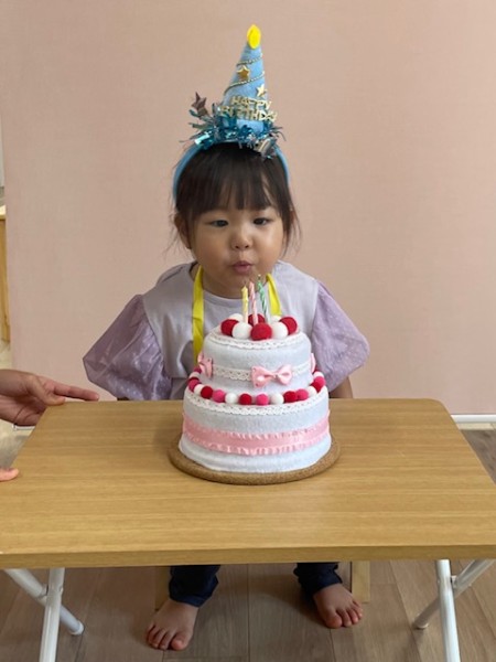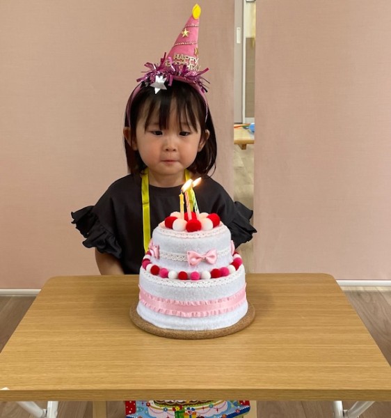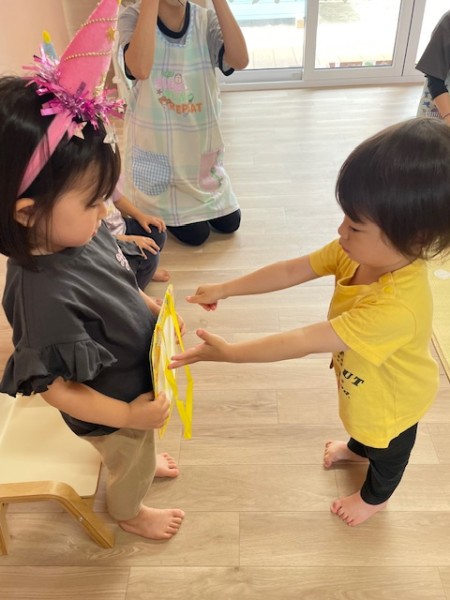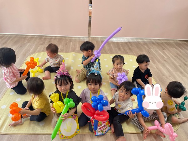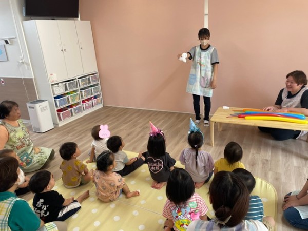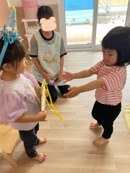 誕生会がありました!7月生まれのお友達は2名!少し緊張しながらも、上手に名前や好きな食べ物、好きな遊びを教えてくれました(^o^)保育士からの出し物はバルーンアートクイズ!だんだん形が出来ていくと、「犬!」「キリン!」と大きな声で答え、正解すると大喜びの子ども達でしたよ☆最後は、誕生児さんにお花や好きな動物をプレゼント!他のお友達も、好きな剣や動物を選び楽しんで参加していたつき、ほし組さんでした♫