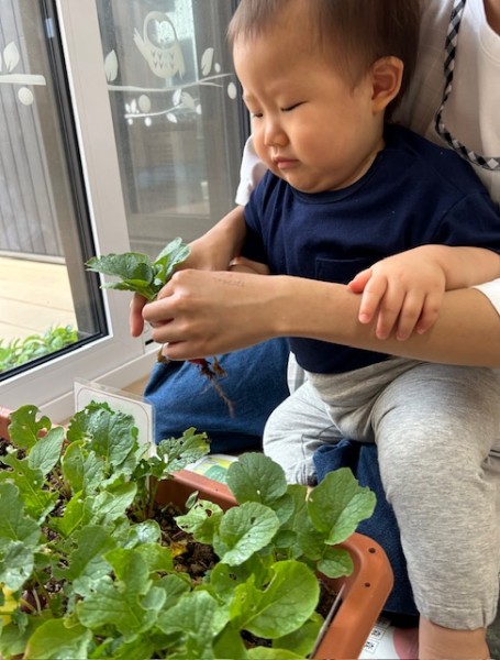 参観日の時に保護者の方と一緒に植えた、ラディッシュを収穫しました!毎日朝の会終了後、「大きくな〜れ!」と言いながら水をあげ育てていきましたよ^_^収穫した次の日には給食に!!初めて食べる子もいましたが、不思議そうな顔をしたり、「美味し〜」と言いながら食べていました(^o^)