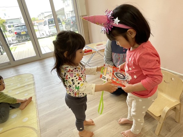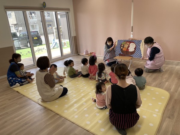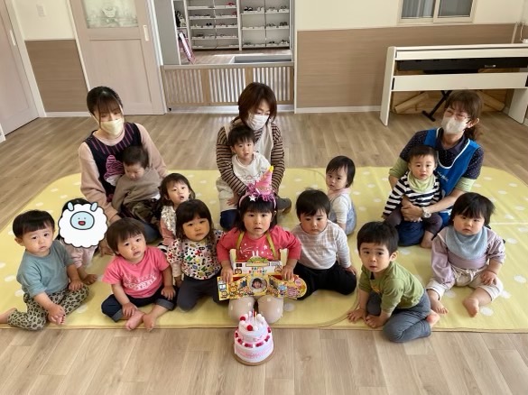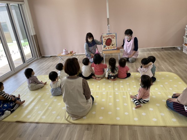 5月22日にお誕生会がありました⭐︎誕生児がかわいいカチューシャをつけて登場♡インタビューでは好きな食べ物や遊びを聞きましたよ。保育士の演し物は大型絵本『おべんとうばこのうた』でした♪みんなで一緒に歌いながら楽しく読みました!