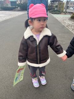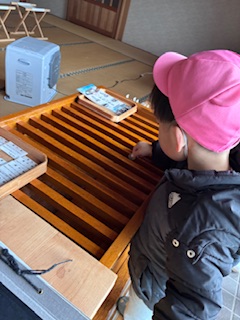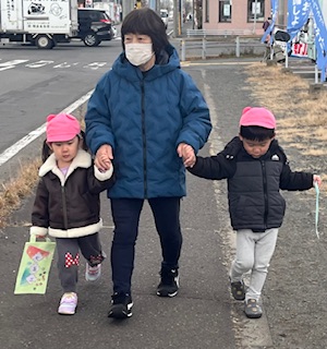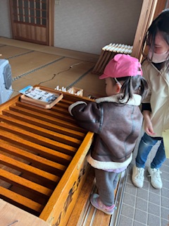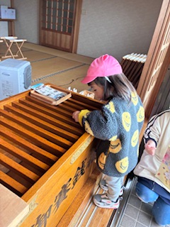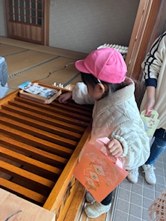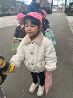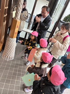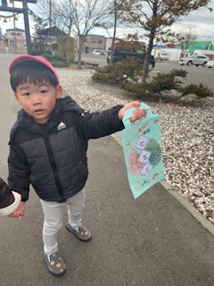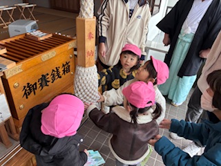 11/14(金)に製作で作った千歳飴袋をもって近くの神社へ!『ニ礼・二拍手・一礼』神主さんに教えてもらいながらお参りしました!お賽銭を入れ、みんなで本坪鈴を鳴らして手を合わせ「元気で大きくなりますように・・・」とお願いしましたよ♪お迎えの際に、千歳飴をプレゼントするととっても喜ぶほしぐみさんでした⭐︎これからも子どもたちの成長を見守っていきたいと思います(^^)