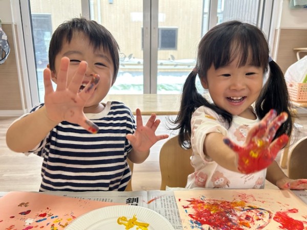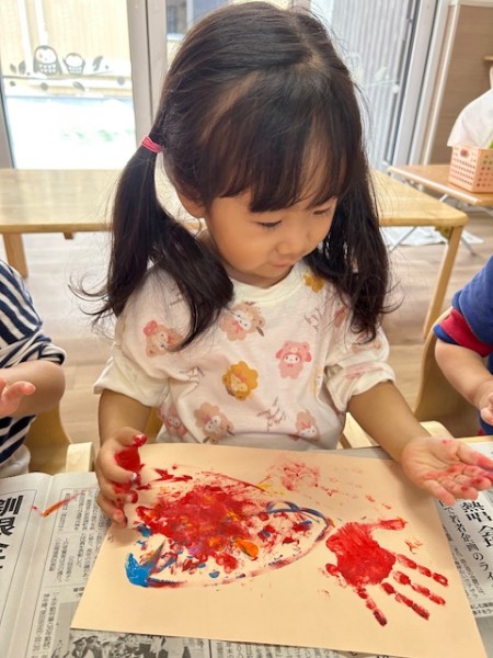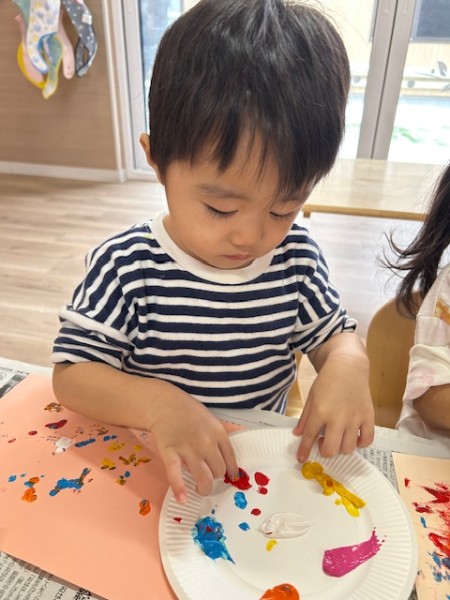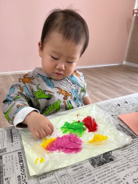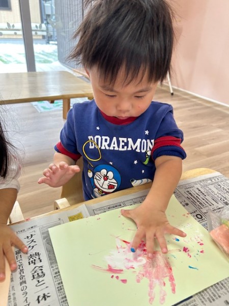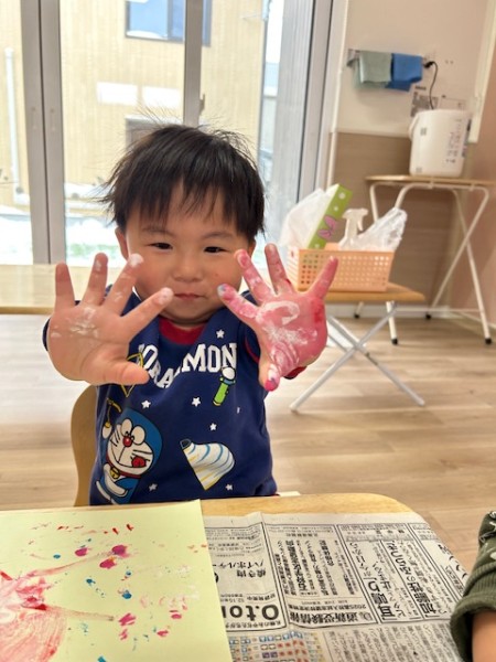 つきぐみさん絵の具遊びをしました!!用意をしていると、「やりたーい!」と早くやりたい様子でした♪指や手に絵の具をつけ台紙に自由にお絵かきをしていきましたよ(^o^)「手のひらにも付けて〜」と保育士に伝え手形を取ったり、指でお花を描いたり!楽しく絵の具遊びに取り組んでいましたよ(^^)手についた絵の具を「見て見て〜ぱぁ!」と見せてくれました👀