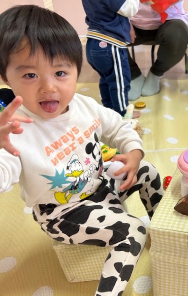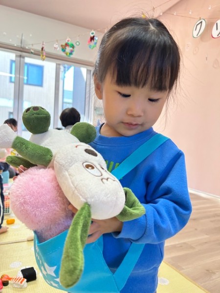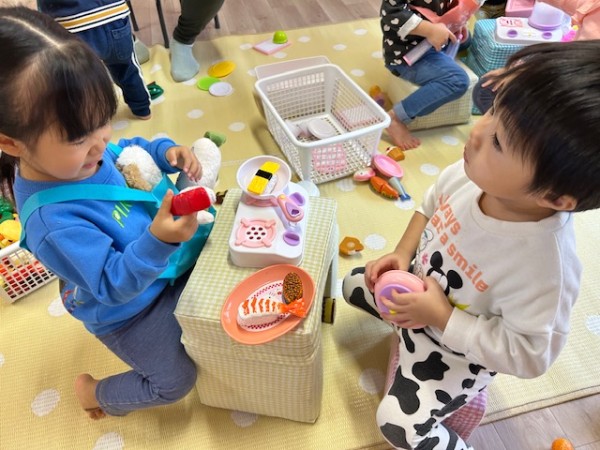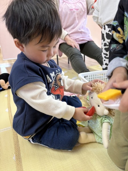 令和7年12月12日つき組ほし組合同でおままごとや人形遊びをしました!おままごとでは、机の上に食材を並べ、お友だちとお料理をしたり誕生日パーティーを開いたり!(^o^)人形遊びでは、お布団を掛け寝かしたり、ご飯をあげたり、抱っこしてお散歩をしたり…と、各々楽しんで遊んでいましたよ♪