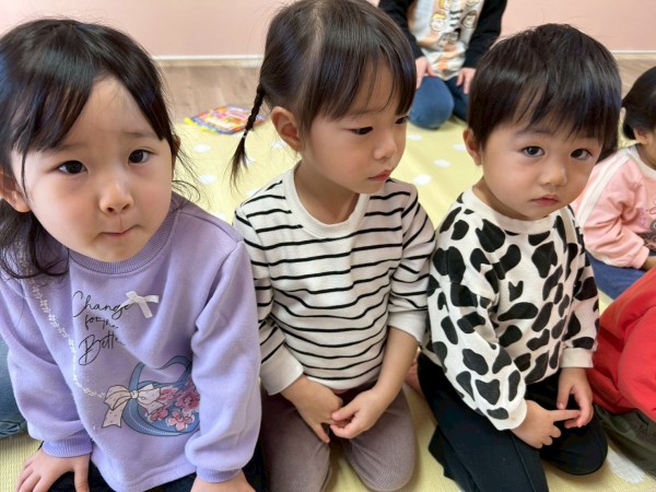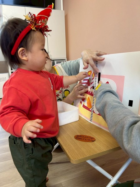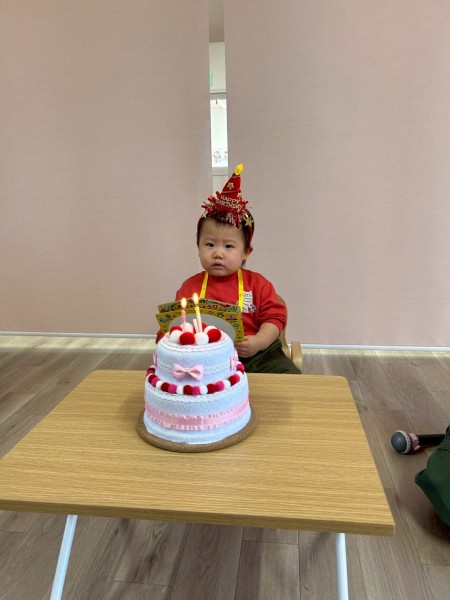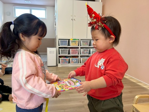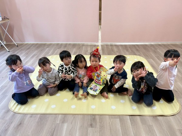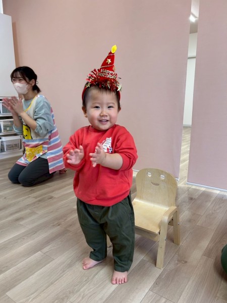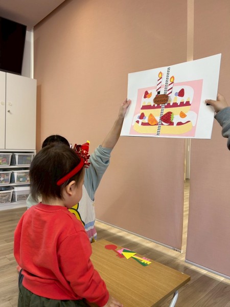 12月生まれの誕生会がありました!今月のお誕生児さんは1名!みんなの前に出て不思議そうな顔をしていましたが、お友達から誕生カードをもらいにこにこ笑顔になっていましたよ(^^)せんせいからのおたのしみは「魔法の鍵🗝」を披露しました!色んな色の鍵を選んでどこかに隠れている果物やろうそくを探してもらいました!最後に誕生児さんに飾り付けをしてもらって完成✨みんな「うわぁー!ケーキだー!」と楽しんでいました(^^)