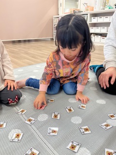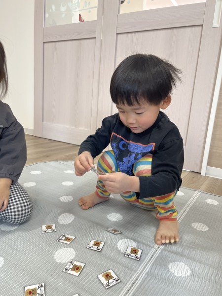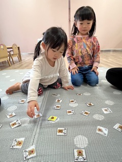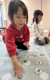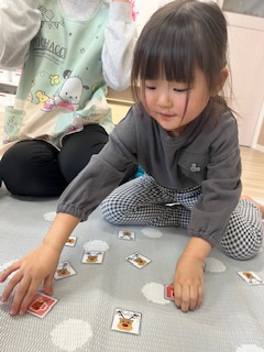 クリスマスのカードを使って神経衰弱をして遊びました!1枚のカードにねらいを定めペアを探す子もいればいろんな所を探す子どのカードにしようかじっくり悩む子もいました!お友だち同士で「ここにあるよ」と教える姿も見られましたよ!カードが取れても取れなくても、「やったー!」「ざんねーん!」とみんなで楽しみました♬みんな1枚以上カードをゲットすることができて、大満足な様子でした(*^▽^*)