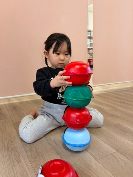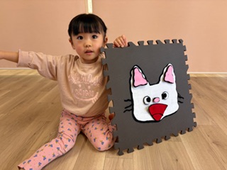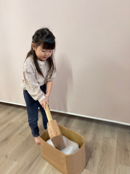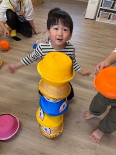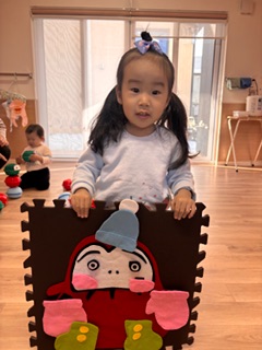 お正月遊びをしました!ダルマ積みでは、中に鈴や粘土などが入っていてバランスを取るのに難しかったのですが、お友だちと一緒に協力しながら高く積むことができました✨福笑いでは、「どこかな〜?」と探しながらはっていき、面白い顔になったり、可愛らしい顔になったり…!楽しんでいる様子でした(^^)もちつきでは、「1.2.3...」とみんなで数を数えたながら餅をついていきましたよ♪