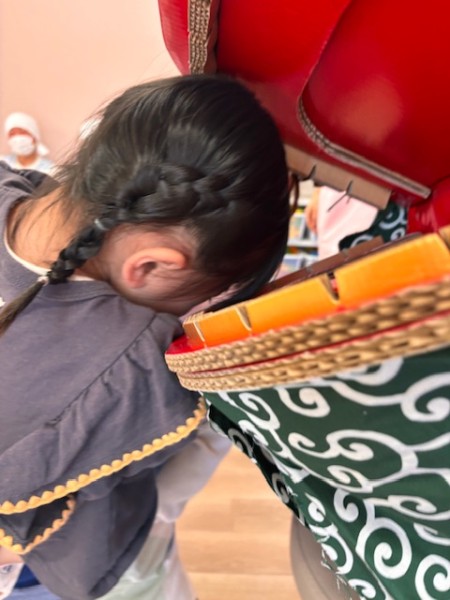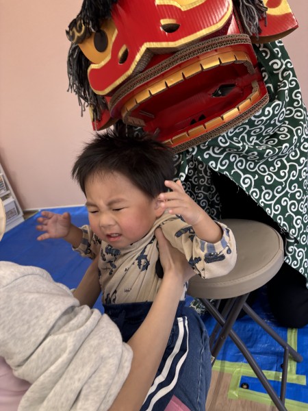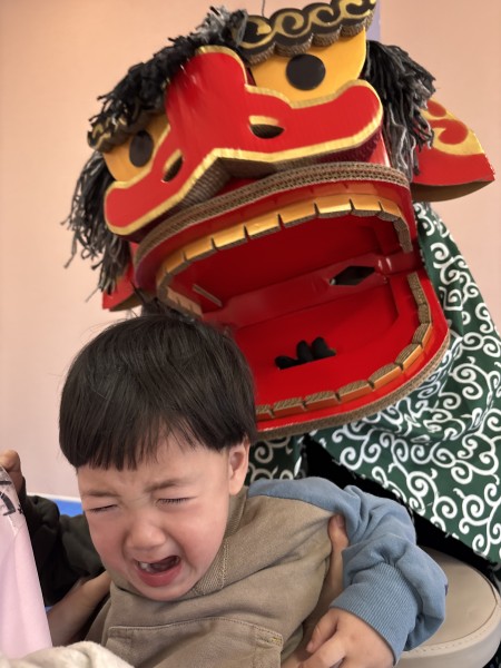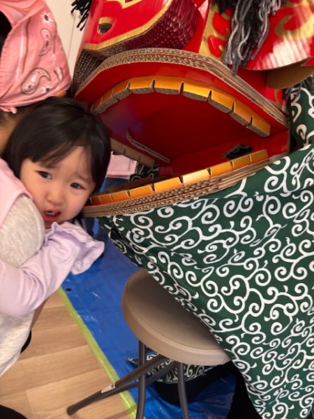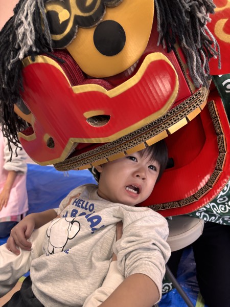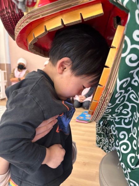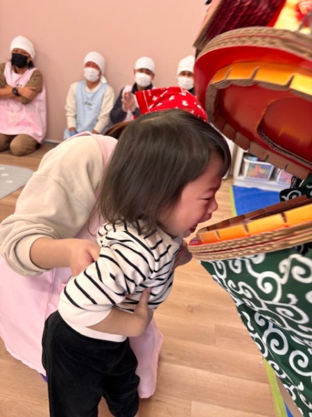 1月15日(木)に新年お楽しみ会がありました!絵馬や獅子舞にちなんだお話をした後、大きな獅子舞が登場!!怖がりながらもありがとうやバイバイを言って頭を〝がぶっ〟とかじってもらいましたよ✨今年の餅つきはキッズベースかつらの学童さんも参加してくれました!力強い餅つきを見たあと、子どもたちも「よいしょ!」と言いながらお餅をぺったんぺったんと餅をつきました♡そのあとは実際についたお餅を〝こねこね〟丸めてもらいました!初めての感触に驚きつつも楽しそうな子どもたちでした🎶