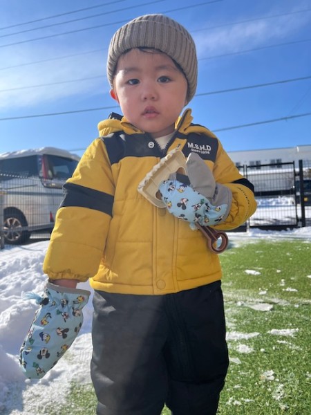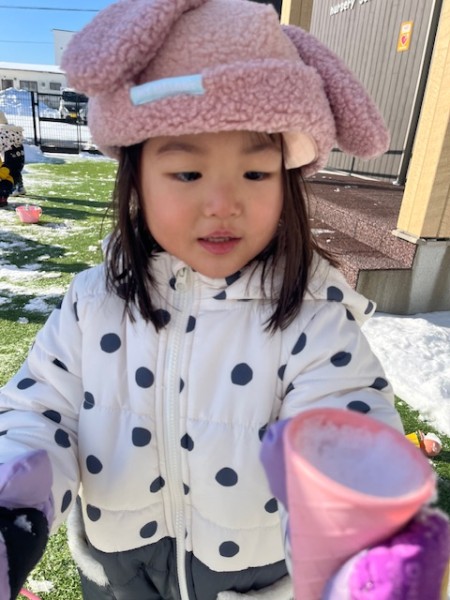 雪遊びをしよう!と伝えると「やったぁーー!!」と大喜びのこどもたち✨園庭に出ると「さむいね」「ゆきつめたいね」と言いながら雪を集めて楽しんでいましたよ!!先生にソリを引いてもらったり雪を詰めて型抜きをしたりたくさん遊んで大満足のこどもたちでした( ^∀^)