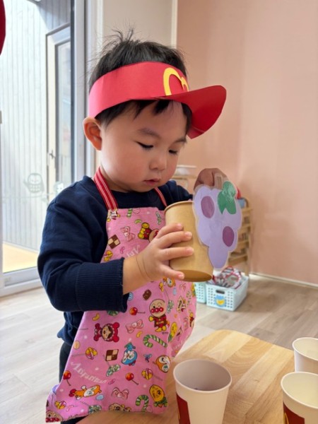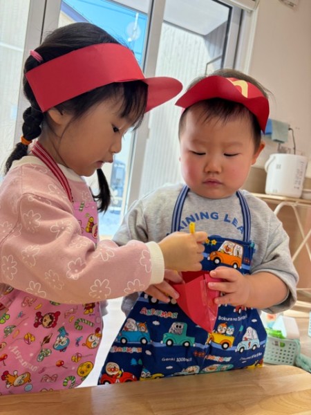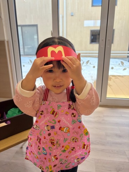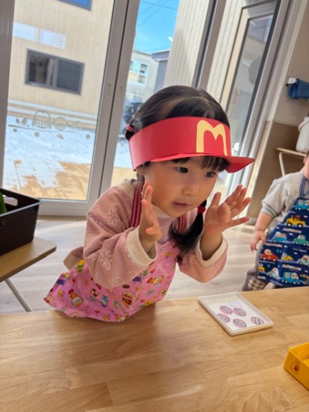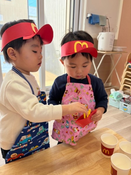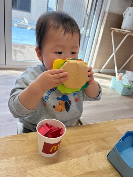 つき組さん「マック」のお店屋さんごっこをしました!「いらっしゃいませー!」「どれにしますかー?」と言ったり、ハンバーガーやポテト、ジュースを店員さん同士で協力し作り楽しんでいる様子でしたよ(^^)お客さん側はお金を持ち、「これください!」とウキウキしながら出来上がりを待っていました♪最後は椅子に座りみんなで美味しく頂きました😄