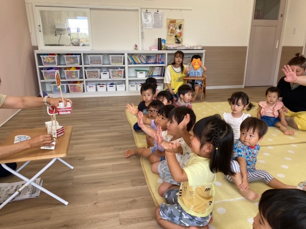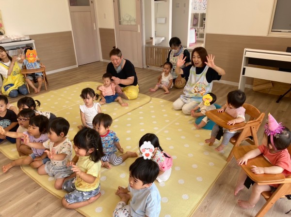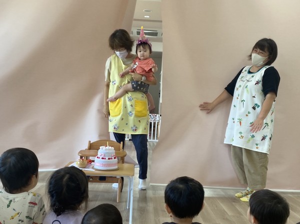 8月24日にお誕生会がありました!保育士に抱っこされながら誕生児が登場すると、みんな拍手で迎えてくれましたよ♪誕生児へのインタビューやハッピーバースデーの歌を歌った後は、紙皿シアターと『みずあそびしたいな』のパネルシアターが始まり、子ども達はとっても楽しそうでしたよ☆