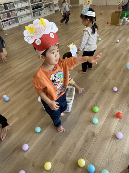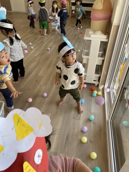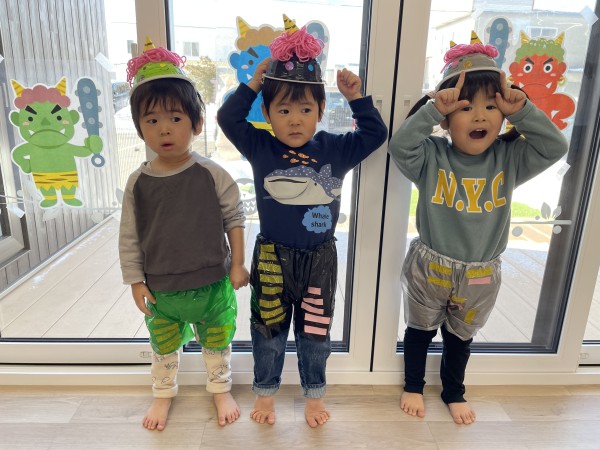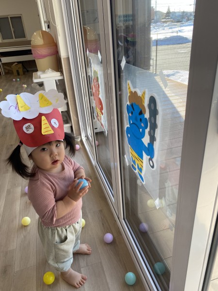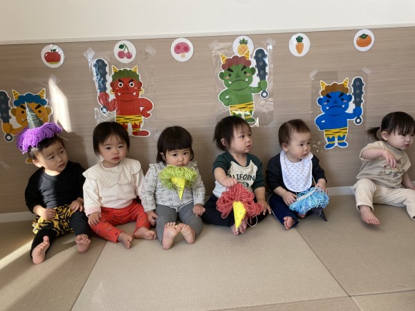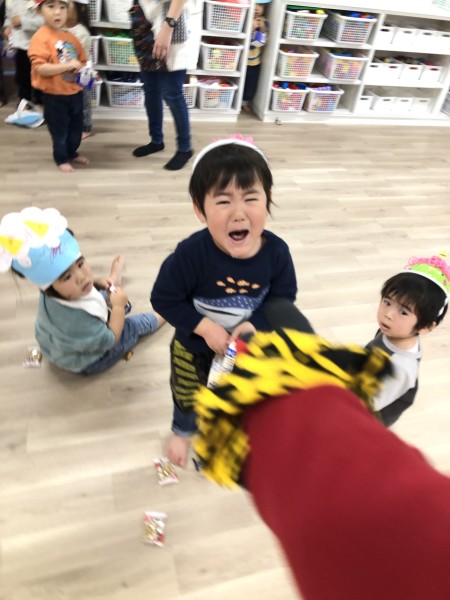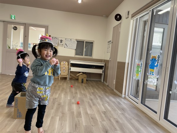 2月2日に節分がありました!各クラス節分にちなんだ的当てゲームをして楽しみました!その後は、ホールに集合し豆まきの歌を歌っている時に「ドドドドン!」といった太鼓の音と共にかつら保育園にも赤鬼がやって来ました!鬼の登場に驚き、泣きながらも勇敢に豆を投げているお友達や保育士に抱っこされているお友達など色々な姿が見られました。赤鬼さんと仲直りした後は「バイバーイ!」と手をふりお別れしましたよ^^