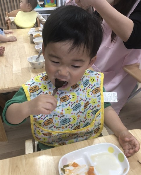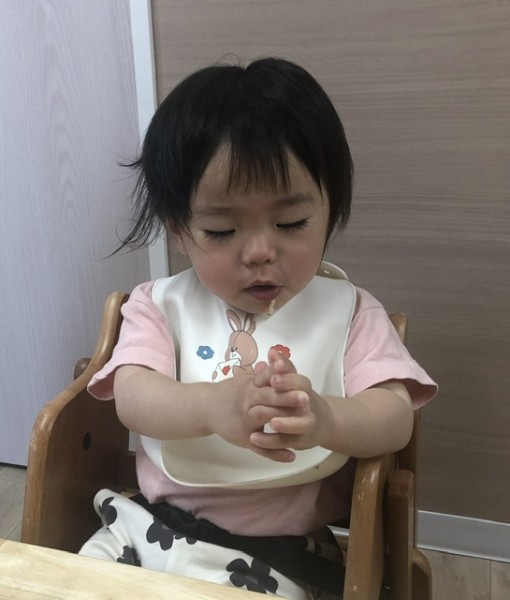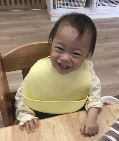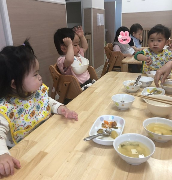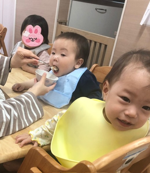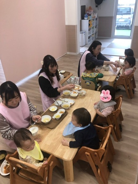つきぐみさんの給食の様子です(*´꒳`*) 毎日賑やかに?!笑 食べています♡先生と一緒に少しずつ自分で食べる練習もしていまーす(๑>◡<๑)