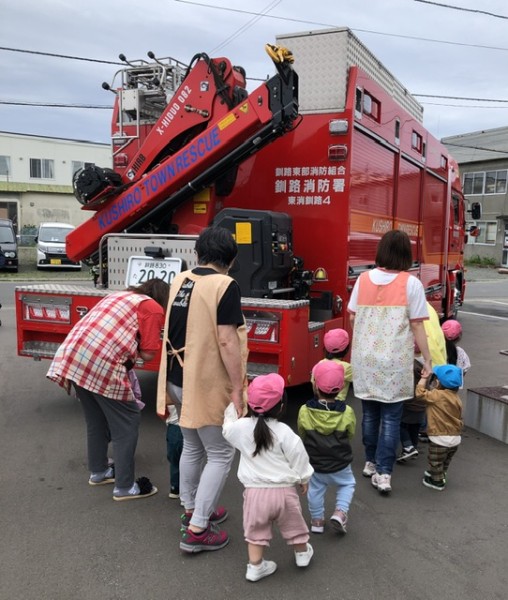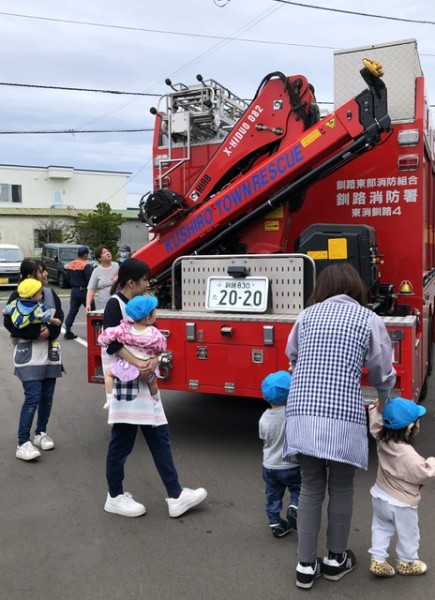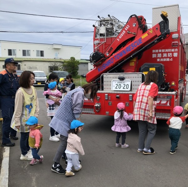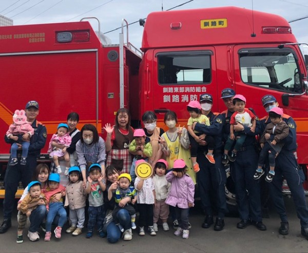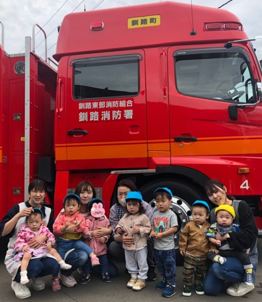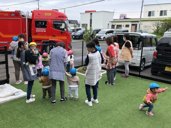 さて!避難訓練を頑張った後のお楽しみは。。。消防車の見学です(*´∇`*)優しい消防士さん達が消防車の説明をしてくれたり、敬礼の仕方を教えてくれたり、抱っこしてくれたりしました♡記念に皆んなでハイポーズ♡消防士の皆さんありがとうございました!最後は皆んなでバイバーイとお見送りしました╰(*´︶`*)╯♡