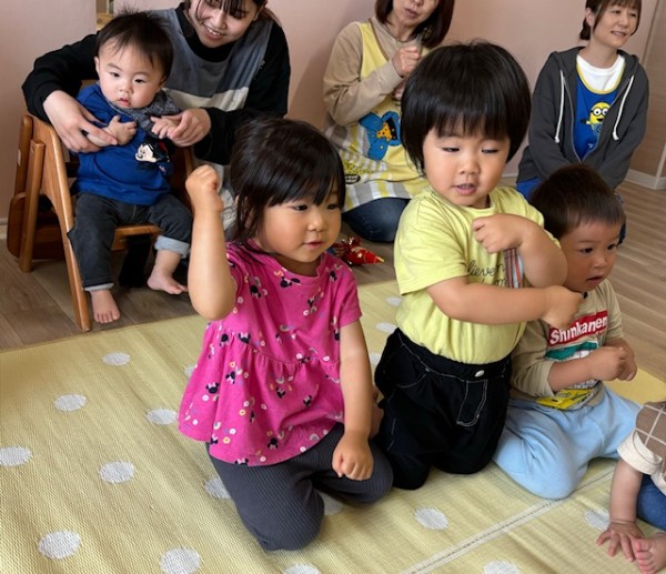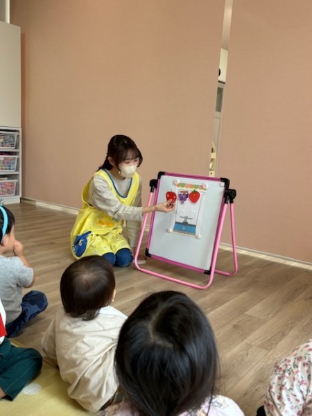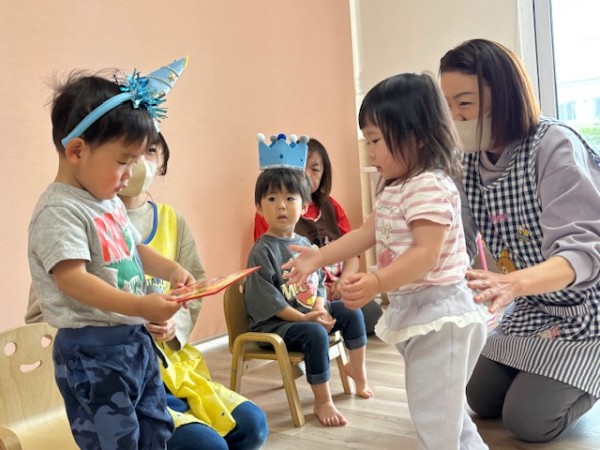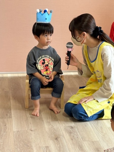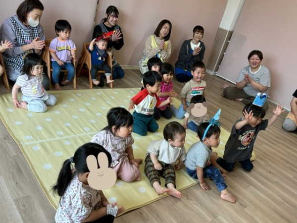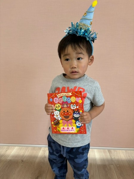 6月生まれのお友だちの誕生会がありました(^^)各クラスから1名ずつ6月生まれのお友だちがいましたよ〜♫インタビューの後は歳の数だけローソクの火をふーーっと消したり、誕生カードを貰ったりと緊張しながらも楽しんで参加出来ていました♡保育士からのおたのしみはシルエットクイズとミックスジュースの手遊び!!盛り上がっていました♫