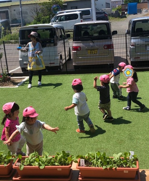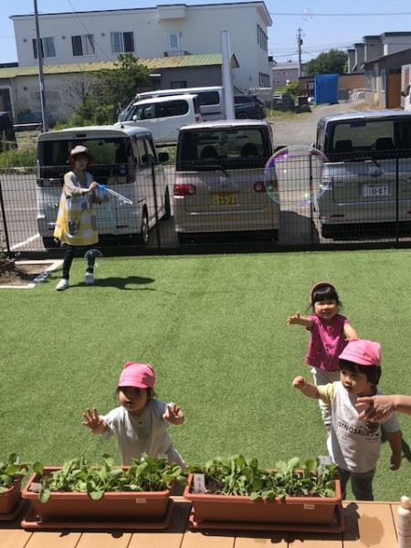 今日は朝から快晴で気持ちが良いですね!風も心地良く吹いていたので、ほしぐみさんは園庭でしゃぼん玉をして遊びました╰(*´︶`*)╯♡ しゃぼん玉を追いかけて、たーくさん遊んでいましたよ!