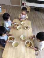 非常用として保育園に備蓄してある食料を給食として食べました!非常時だという設定で、使い捨て容器やカラトリーを使い、ホールに集まりみんなでいただきます!メニューはカレーライス・フルーツ缶詰・春雨スー...