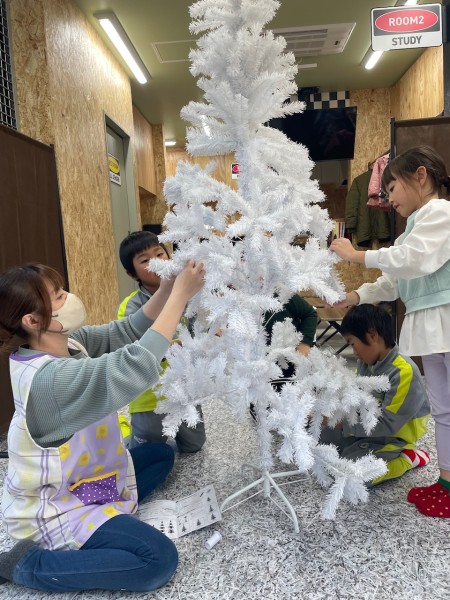 キッズベースにもクリスマスツリーがきました☆ ツリーの飾り付けをお願いすると、「やりたーーい!!」と大盛り上がり!バランスを見ながら可愛く飾り付けをしてくれましたよ♫